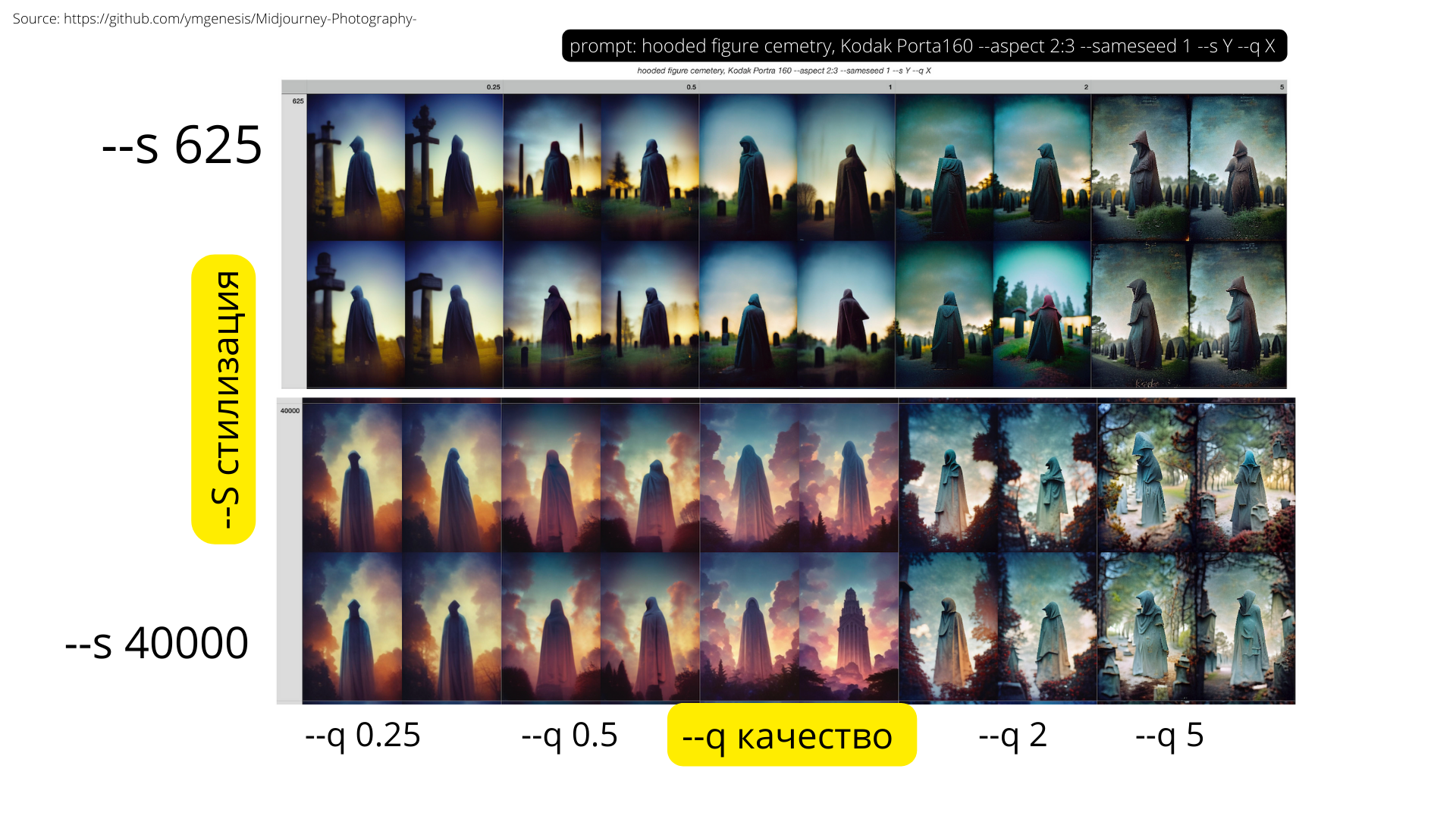 --s - стилизация и -q -качество. По умолчанию --s2000, предельные значения до 60000 , а качество --q1 и до пяти. Наглядно тут и тут (фотоаппарат Kodak)